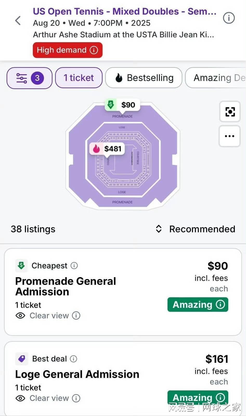 而相较于亲民的阿姆斯特朗球场,想进阿瑟.阿什球场可就没那么容易了,毕竟中央球场最便宜的门票都高达90美元,这几乎比往年票价翻了4倍还多。要知道,这可是相当于人民币650元左右哦,而其中最佳观赛位置,如中央球场前排的门票更是高达481美元,相当于人民币3500元左右。