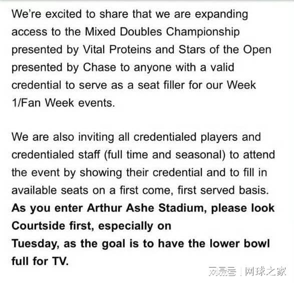 然而,这光鲜的数据背后却藏着不愿公开的秘密。根据记者Ben Rothenberg获得的内部邮件显示,美国网协曾邀请所有持证的工作人员(包括球员团队成员和美网很多的工作人员)去填补空座,以免电视转播时出现空座的尴尬场面。